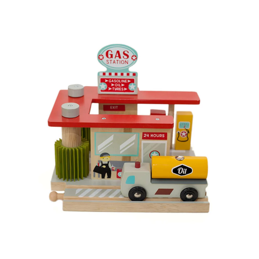 Kettő az egyben, tankolj és mosd le autóid ezzel a szettel, mely kompatibilis fa vonatkészleteinkkel.