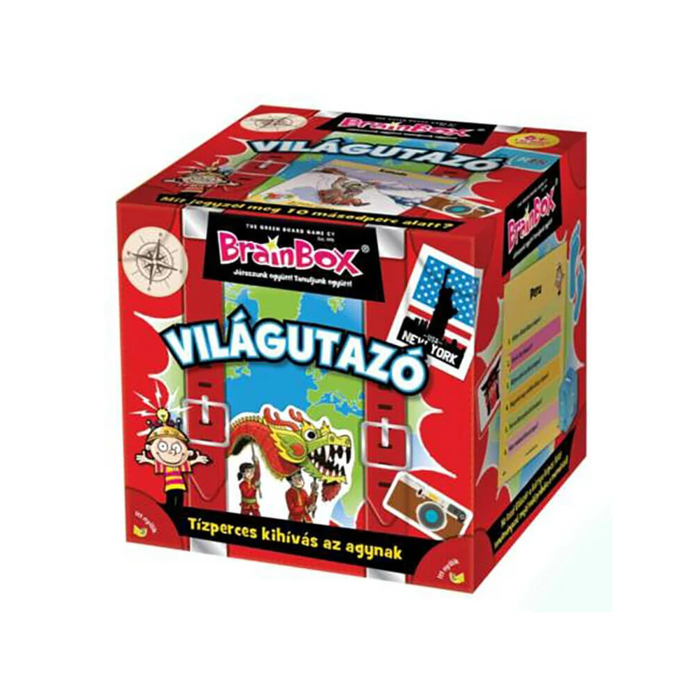 Te mi mindent tudsz világunkról, a különböző kultúrákról? A BrainBox - Világutazó társasjáték segítségével most végre letesztelheted általános tudásodat egy vicces, az egész család számára nagyszerű kikapcsolódást és szórakozást garantáló agytornával. A BrainBox Világutazó 55, rajzokkal illusztrált kártya segítségével mutatja meg nekünk, mit kell tudnunk a különböző nemzetekről, kultúrákról, tájakról és nemzetekről. A játék lényege, hogy 10 másodpercig figyelni kell egy kártyát, majd a dobókocka segítségével kiválasztott kérdést kell megválaszolni. Helyes válaszért a kártya megtartható, a végén pedig az nyer, aki 5 vagy 10 perc után a legtöbb kártyát gyűjti össze. Ez az egyszerű játék minden korosztály számára könnyen érthető, többen vagy akár egyedül is játszható. A játék 70%-ban újrahasznosított papírból készül, az Egyesült Királyságban tervezték, nagyszerű szórakozás. A Brainbox játékok népszerűek úgy a gyerekek körében, mint a családok és tanárok között is, mert nemcsak remek szórakozás, hanem tanulás is egyben Tartalom: - 55 kártya - 1 kártya az alapszabályokkal - 1 homokóra - 1 dobókocka.