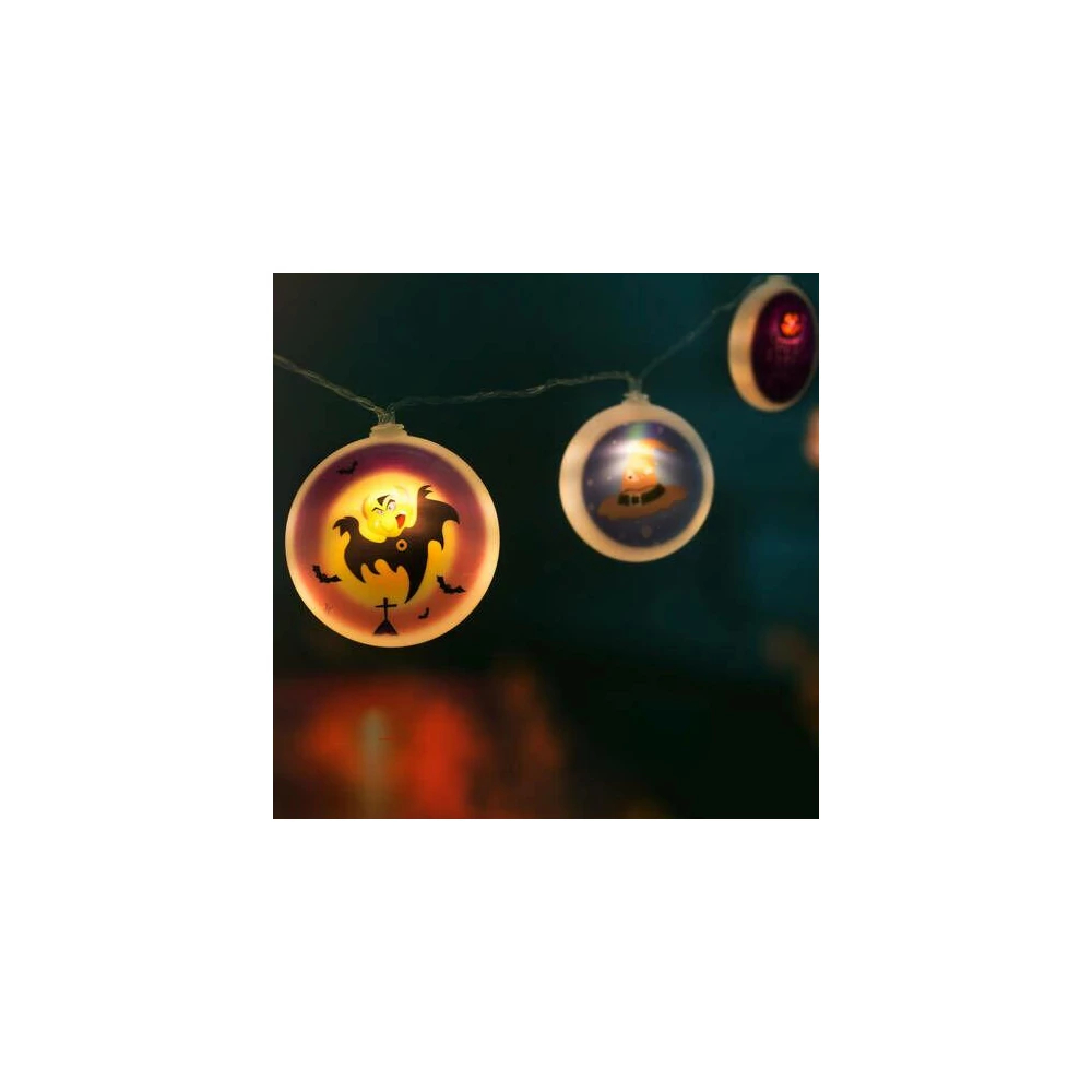 Halloween-i LED-es fényfüzér korongok 1,35m 10 db led 4 féle mintás korong elemes