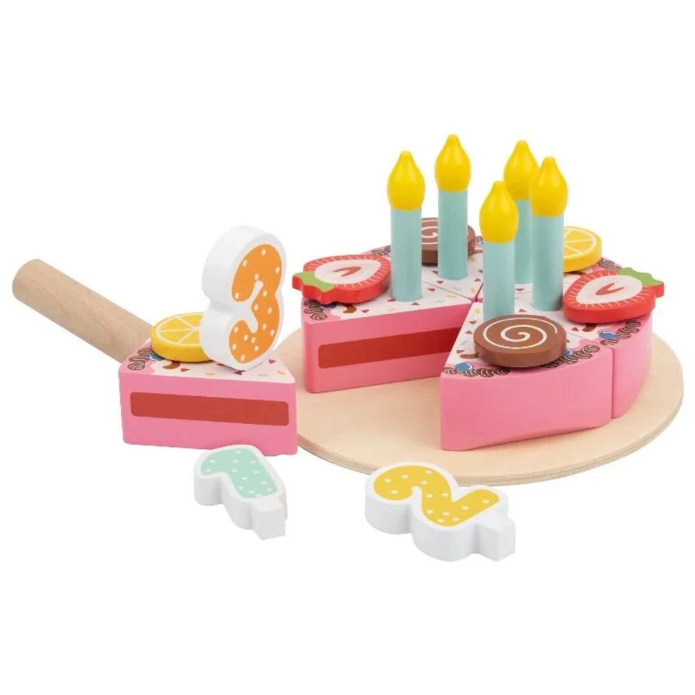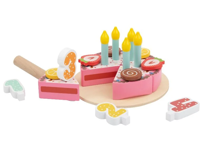Torta kiegészítőkkel: 1 tortatartó, 6 szelet torta, 2 csoki csiga, 2 narancsszelet, 2 eperszelet, 5 gyertya, 4 számgyertya és 1 tortagombóc