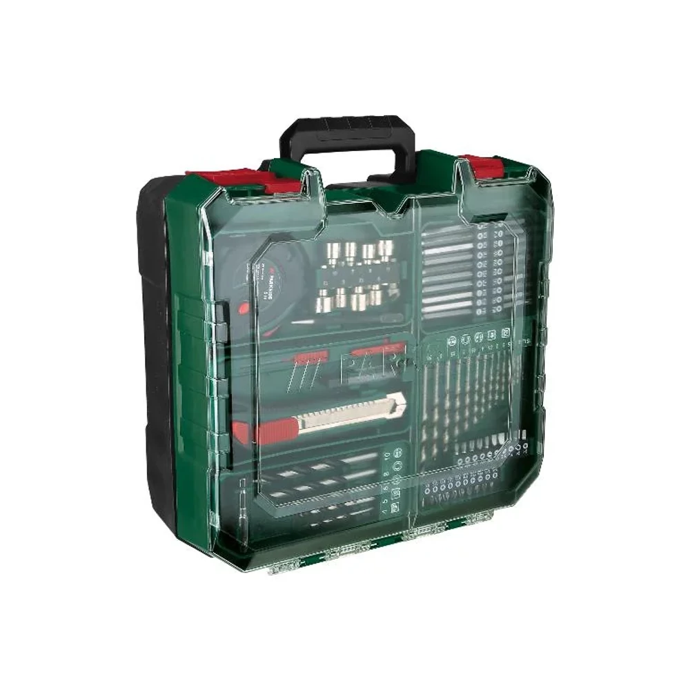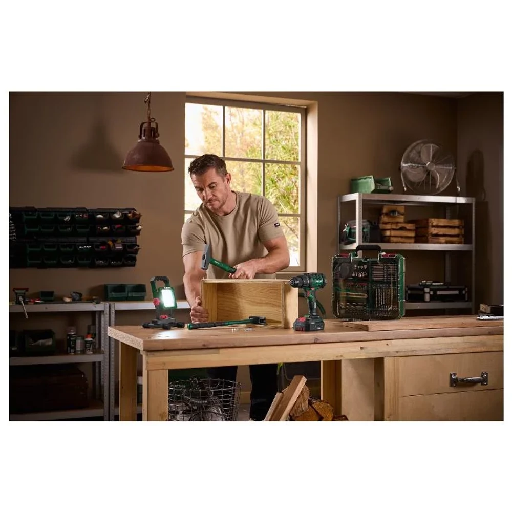 - Mellékelt tartozékok: 2 db 20 V-os (2 Ah) akkumulátor, 1 db 2,4 A-es töltő, 1 db vágókés, 1 db asztalosceruza (2 db tartalék kábellel), 1 db mérőszalag (5 m), 8 db dugókulcs, 1 db süllyesztő, 1 db lyukasztó, 5 db fafúró, 14 db fémfúró, 40 db bit, 1 db bittartó