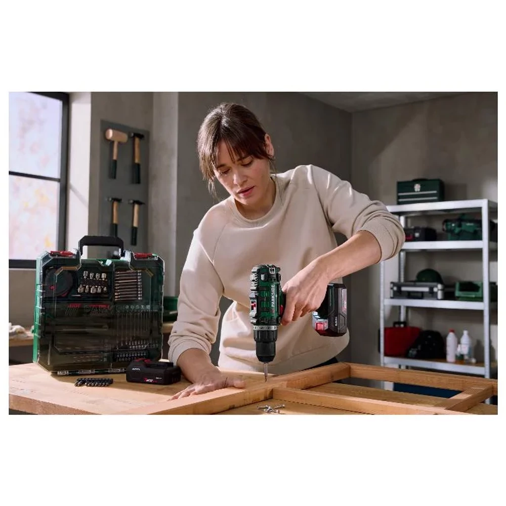 - Komplett készlet akkus fúró-csavarozóval, 2 akkumulátorral, 1 töltővel és számos tartozékkal