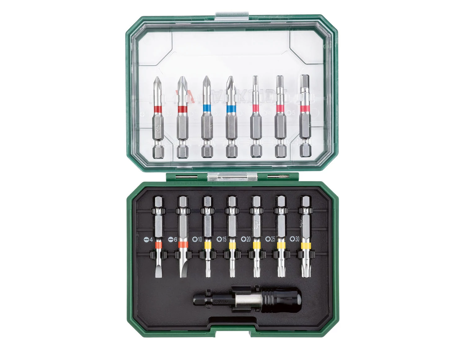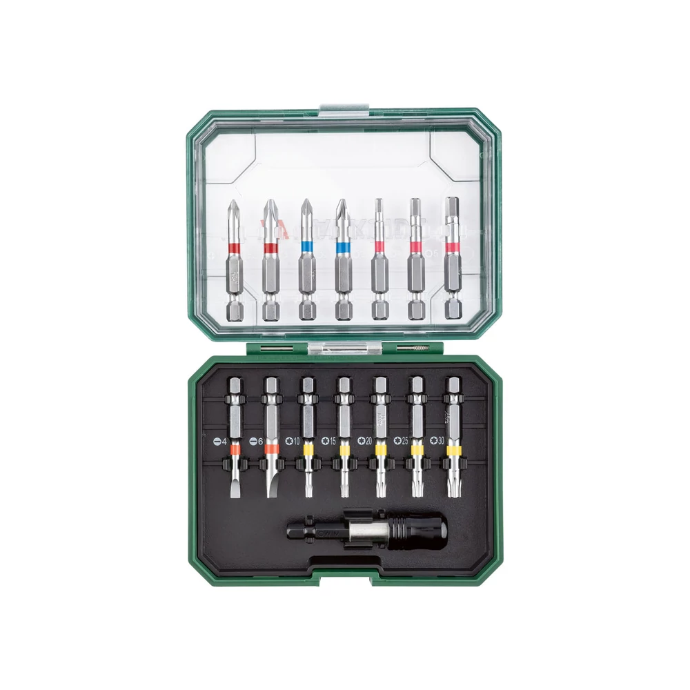 - Színkódolt bitek a legfontosabb méretekben a szokásos csavarhúzó profilokhoz