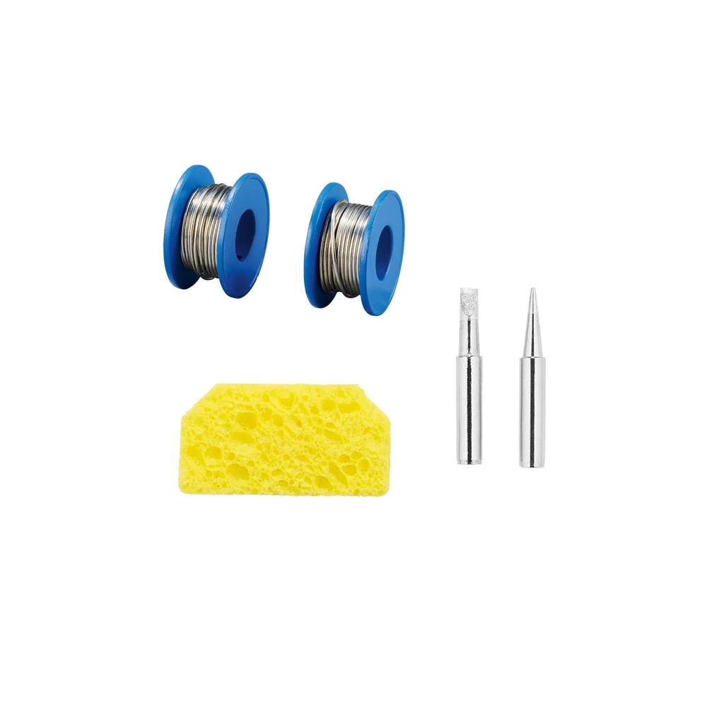 - Mellékelt tartozékok: 2db forrasztóhegy (1 előre összeszerelt), 2 db 10 g-os forrasztóorsó (vastagság 0,8 mm/1 mm), 1 forrasztószivacs