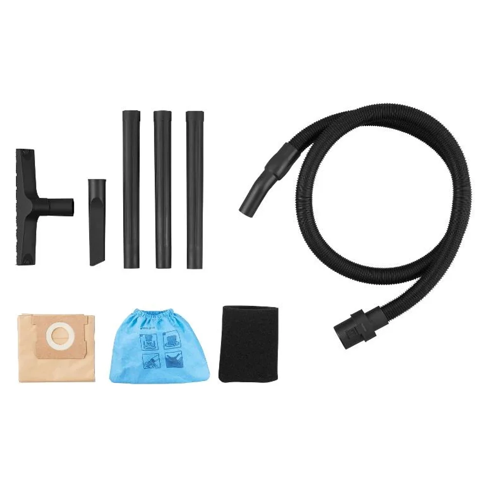 - Tartozékok: 1 db szívócső (2 m), 1 db réstisztító fej, 1 db padlótisztító fej, 3 részes szívócső, 1 db papír szűrőzsák, 1 db textil szűrőzsák (mosható), 1 db habszűrő (nedves porszívózáshoz)