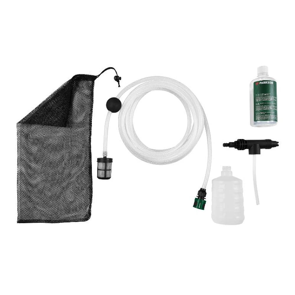 - Tartozékok: 1 db szórólándzsa praktikus multifunkciós fúvókával, 1 db fúvóka tisztítószeres tartállyal (kb. 500 ml), 6 m szívótömlő szűrőkosárral, 1 db tisztítószeres flakon (500 ml), 1 db szállítóháló