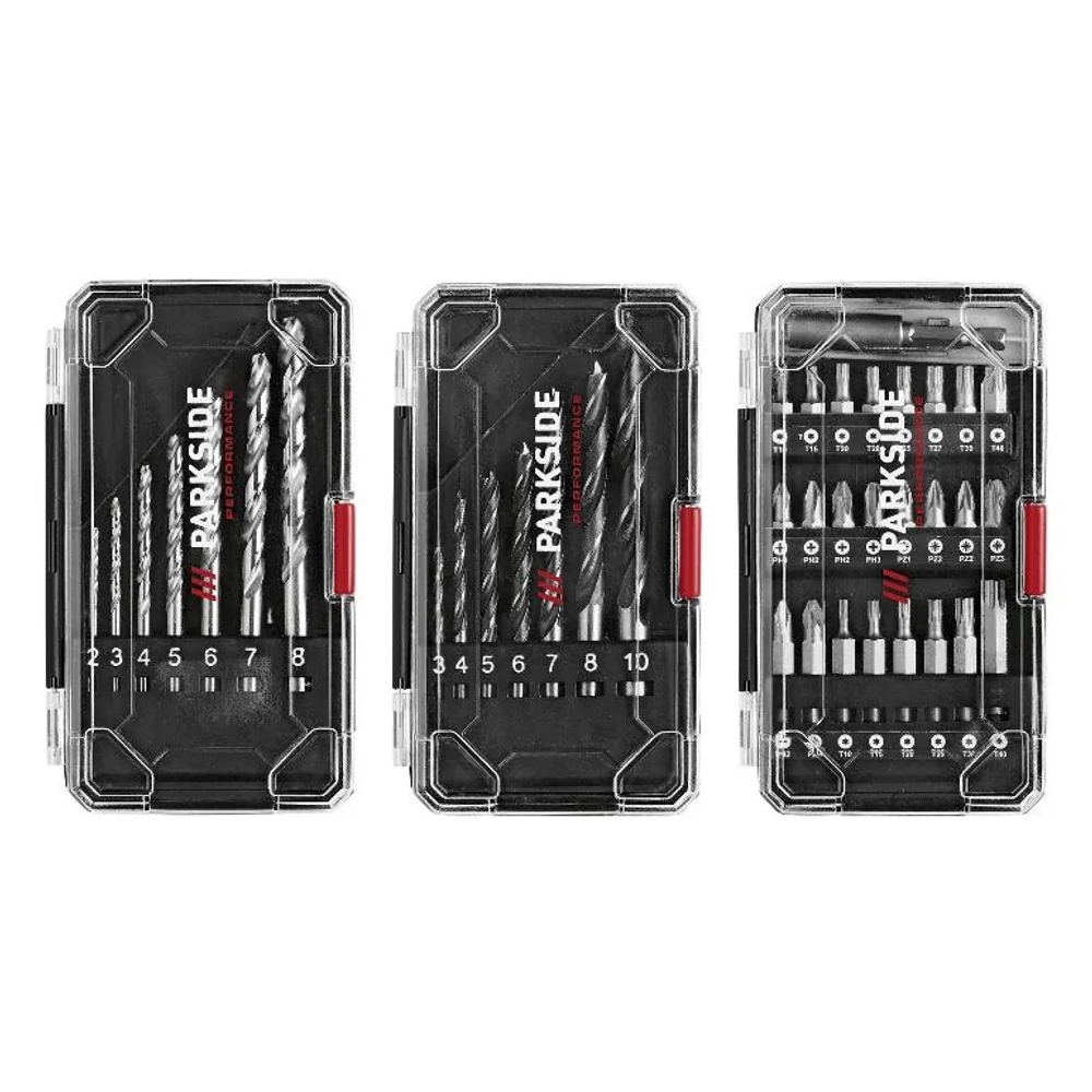 - 3 doboz, egyenként 25 db-os, általános profilú fúrófejjel, 7 db fafúrófej és 7 db fémfúrófej