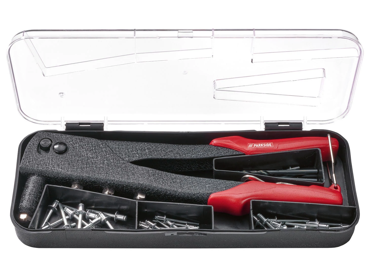 - Tartozékok: 4x HSS fúró (2,4 / 3,2 / 4,0 / 4,8 mm) és 60x vakszegecs (15x 2,4 x 6 mm, 15x 3,2 x 6 mm, 15x 4,0 x 6 mm, 15 x 4,8 x 6 mm)