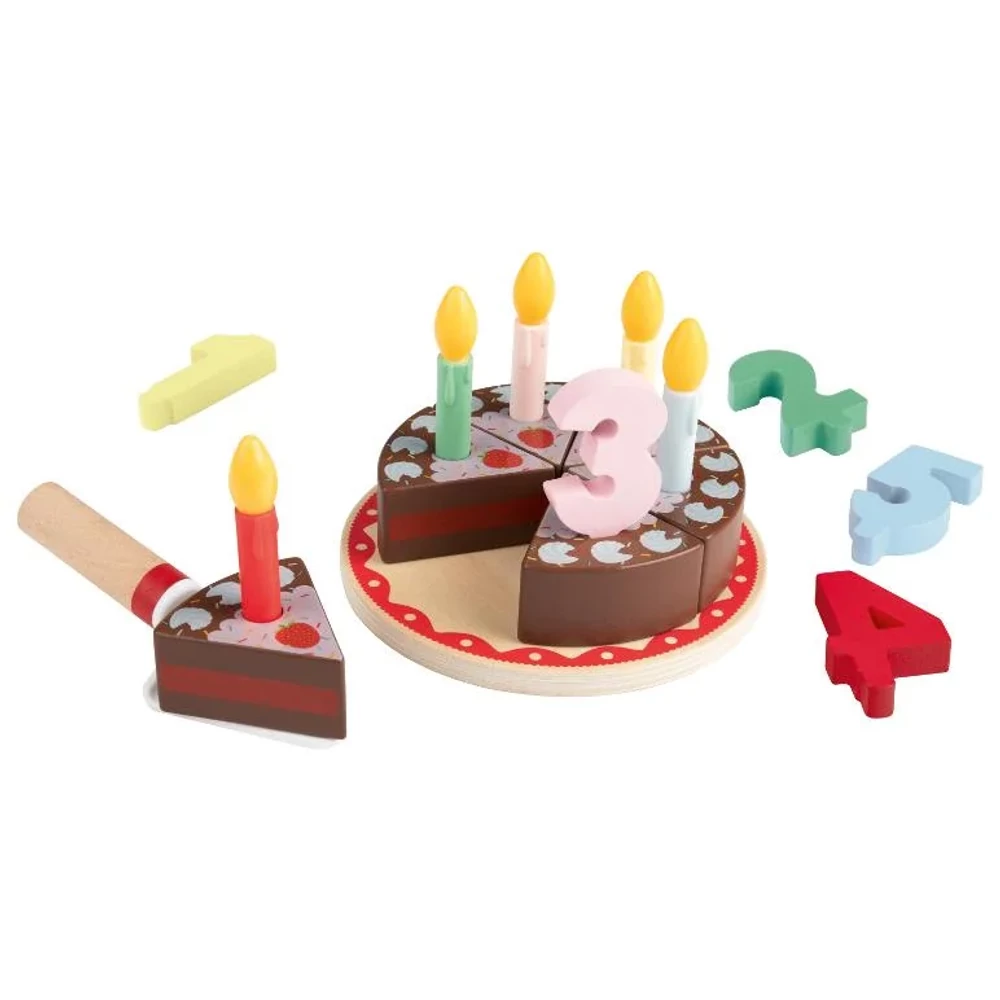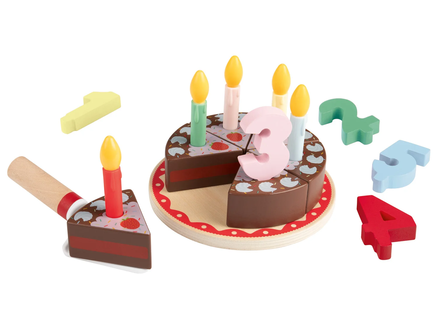 - Ünnepi születésnapi torta műanyag gombóccal fa nyéllel, 5 műanyag gyertyával és 1-től 5-ig terjedő számokkal